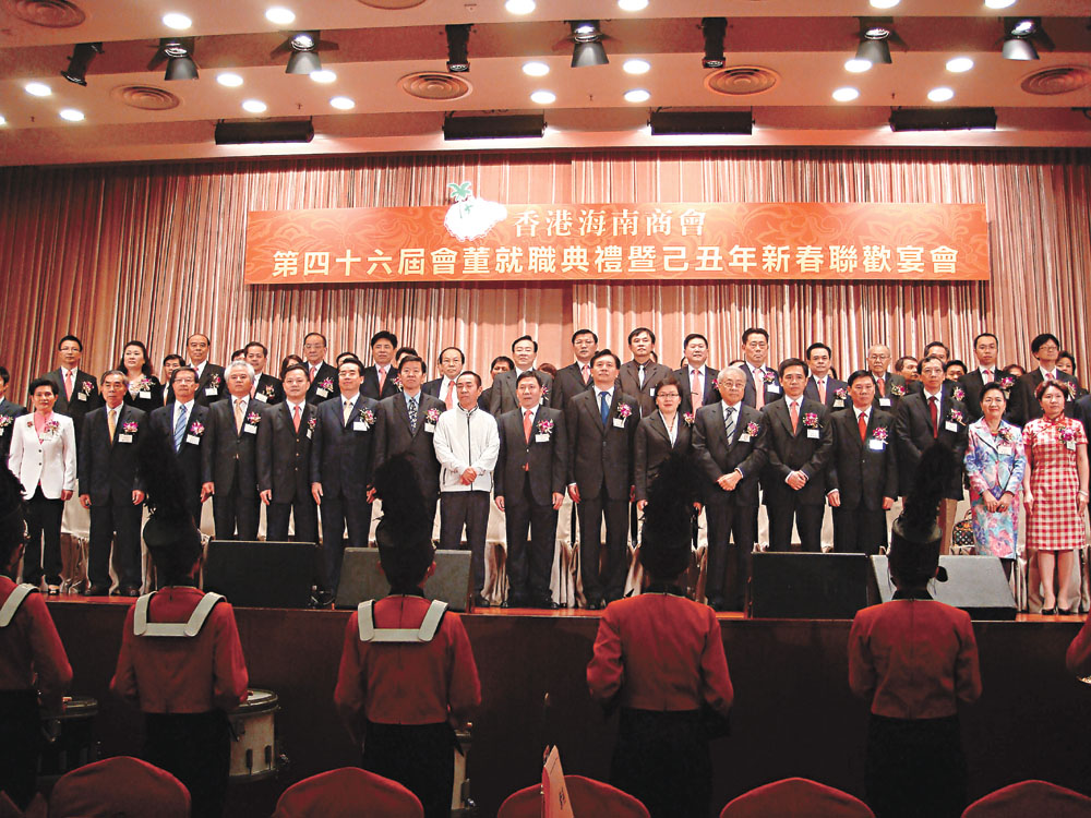 香港海南商會第四十六屆會董就職禮暨己丑年新春聯歡宴會昨晚在尖沙咀龍堡酒店舉行。海南省副省長姜斯憲、中聯辦社團部部長郭鐵生、民政事務局副局長許曉暉、鄉彥邢李㷧應邀出席主禮。