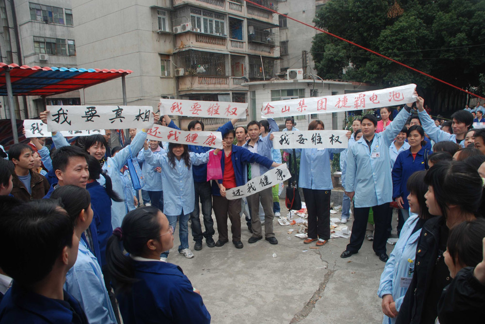 同時,有工人指責電池生產車間環境惡劣,每天工作十一個小時,且自二○○四年有逾八十名工人因有害作業遭檢測尿鎘超標甚至中毒,目前仍有十二名在職的工人受鎘毒侵害而出現頭暈、腰痠痛、全身痠痛等症狀,但未獲廠房支付賠償,其中三人診斷為職業性慢性鎘中毒者,送往廣州住院治療。