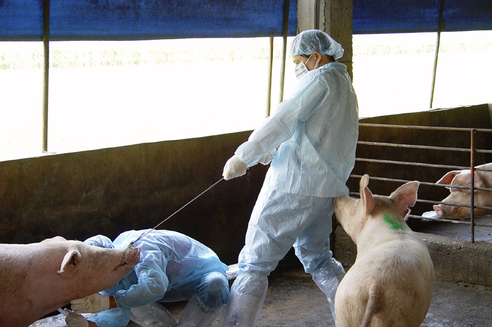 圖:雲林縣有關部門人員正在豬場檢查豬隻的健康狀況(路透社)