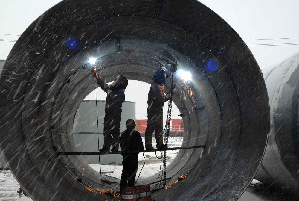 圖:在河北唐山的首鋼京唐公司鋼鐵廠建設工地,工人冒雪施工。該廠全部工程計劃於2010年投產 (新華社)