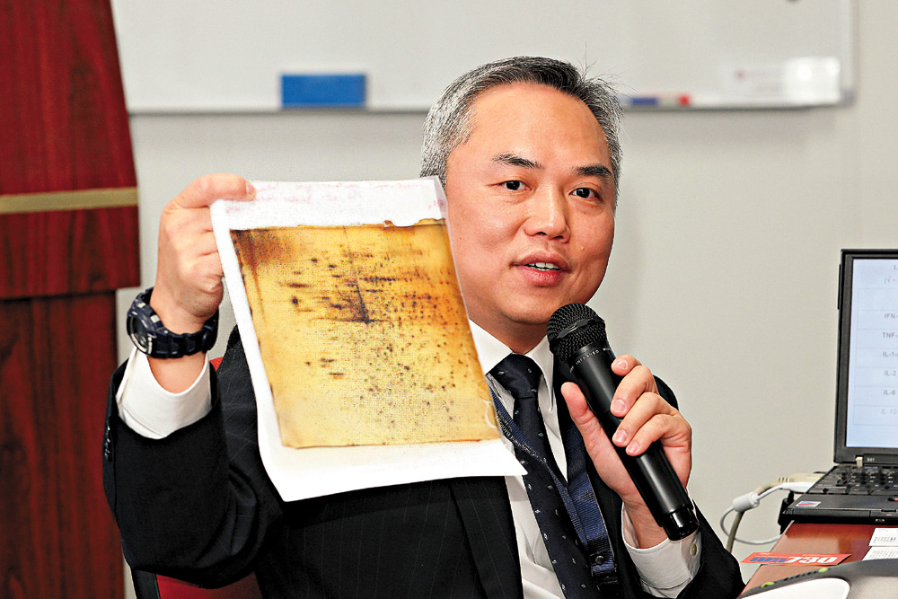 圖:理大應用生物及化學科技學系盧俊立教授展示「白細胞的雙向泳圖譜」,研究員透過該實驗室技術,發現青口油可減少與炎症症狀有關的蛋白質之間的合成