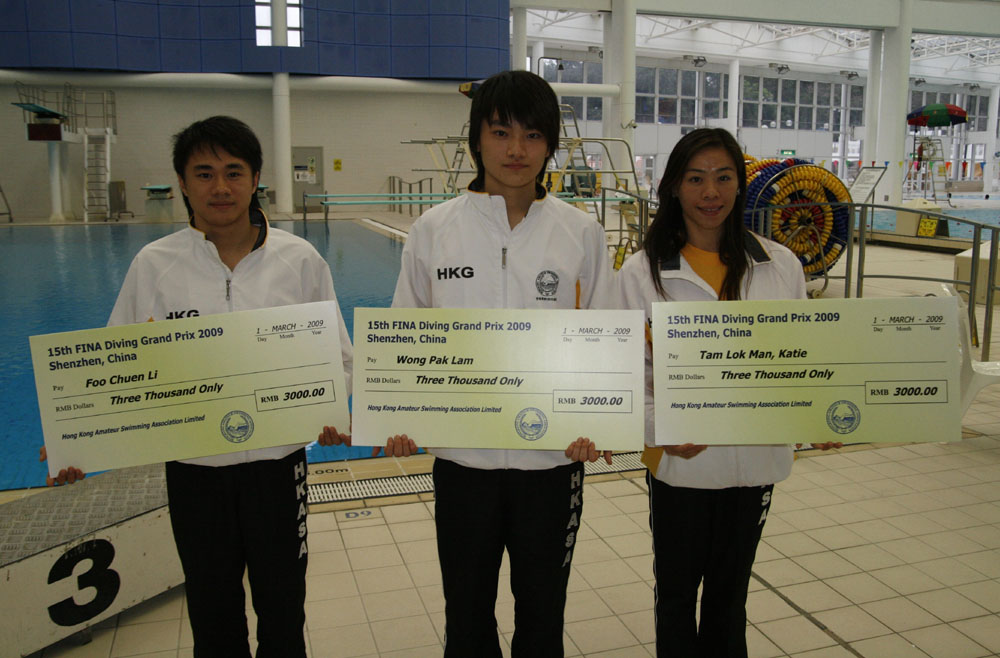 左起:香港跳水代表傅傳理、黃柏林及譚洛雯,於上月中出戰第15屆國際泳聯跳水系列大獎賽深圳站賽事,分別取得男子雙人10米季軍及女子單人10米第5名。3人昨午於九龍公園游泳池領取在賽事中所獲得的獎金。(本報攝)