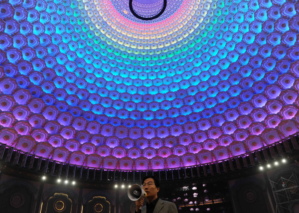 靈山梵宮內另一焦點建築,就是最盡頭的聖壇。聖壇是一個集會議、演出於一身的多功能大型劇場。它呈圓形設計,建築面積3.5萬平方米,可容納1500名觀眾,還設置了全國首個超大型旋轉舞台。劇場上方是30米的巨型穹頂,當穹頂上千多盞蓮花燈一同亮着時,金光璀璨的燈光映照整個聖壇,更顯莊嚴。蓮花燈會隨着音樂大典《覺悟之路》的演出,展現不同的燈光效果,令人心靈共鳴。作為2008年世界佛教論壇主會場的靈山梵宮,成了佛教的新興聖地。(宗教建築•五)