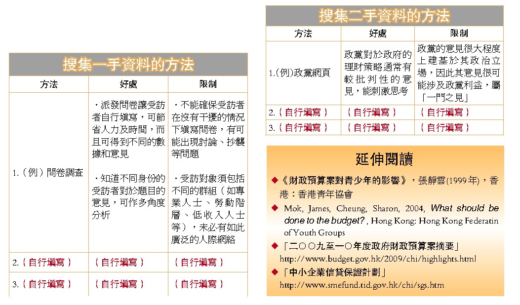 除了一手資料外,同學亦可利用不同渠道取得大量二手資料,方便整理與分析。瀏覽網絡及閱讀文獻是常用的搜集二手資料方法,同學可翻閱政府刊物,知道更多有關政府為應付金融海嘯而推行的理財措施。新年度的財政預算案上周公布,同學搜集資料時可作參考;當中一些重要的資料,同學宜在搜集資料的過程中加以思考,例如: