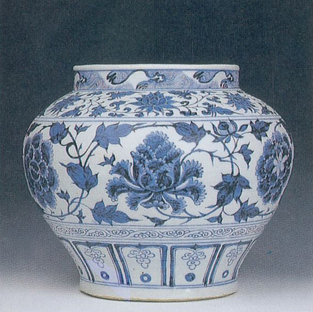 例如附圖為元代青花瓷器的珍品,造型為那時期的大罐,紋飾就是牡丹連枝紋。元代大型瓷器的裝飾層次多,紋飾繁滿。那時的牡丹紋多屬連枝,反而蓮紋的花瓣之間,多互不相連而中繪雜寶及捲草。