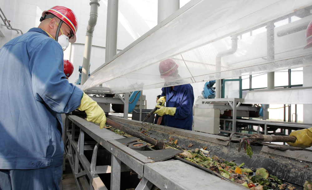 圖:北京首座餐廚垃圾處理廠的工作人員正在流水線上處理餐廚垃圾(新華社)