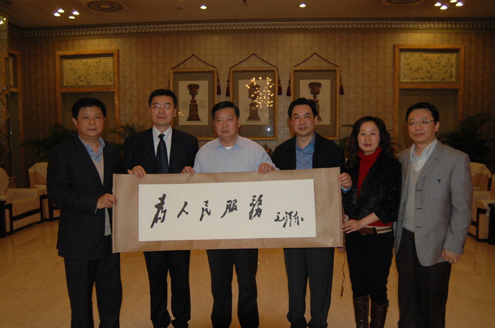圖:大公報總編輯賈西平(左二)贈送畫軸給中信國安集團董事長李士林(左三)。大公報總經理盛一平(右三)、大公報助理總經理梁維果(左一)、大公報公關部副總李群英(右一)、本報記者王榮平(右二)