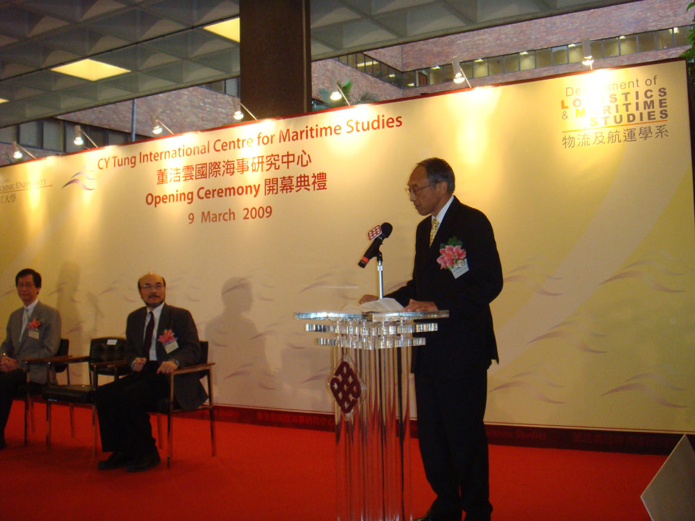 理大校長唐偉章致辭時表示,現時理大是本港唯一提供航運教育的大學,感謝董浩雲一直支持理大發展。董氏慈善基金會代表、東方海外集團主席董建成,理大校董會主席羅仲榮亦出席命名儀式。