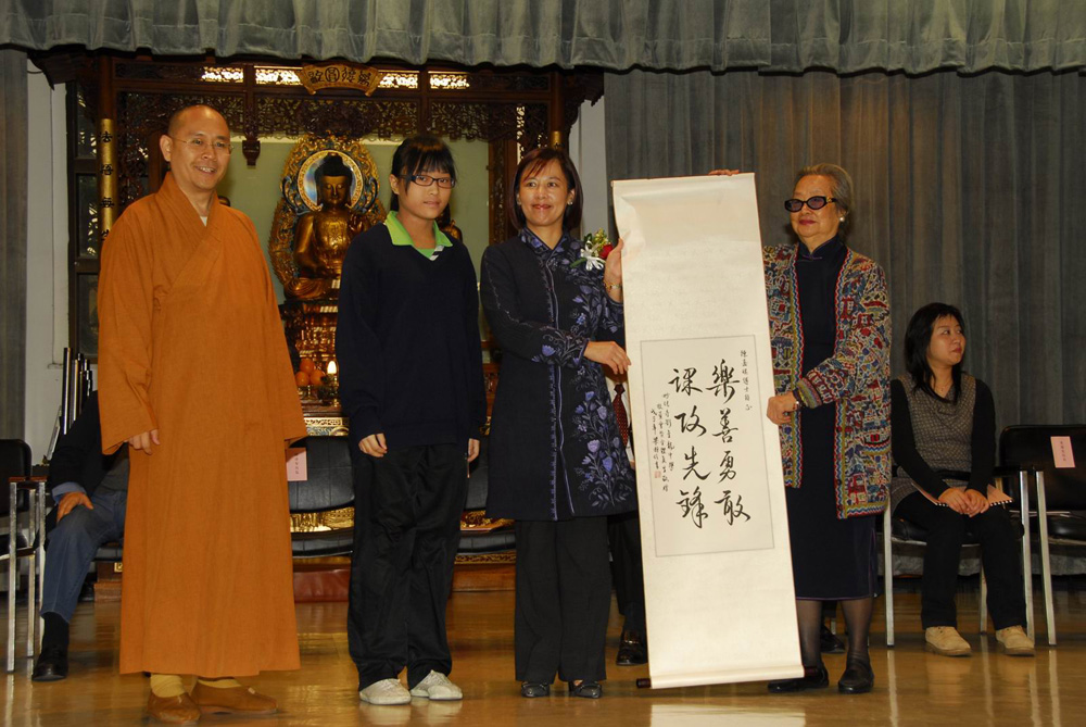 圖:劉金龍中學學生向主禮嘉賓陳嘉琪博士送贈書法作品「樂善勇敢,課改先鋒」