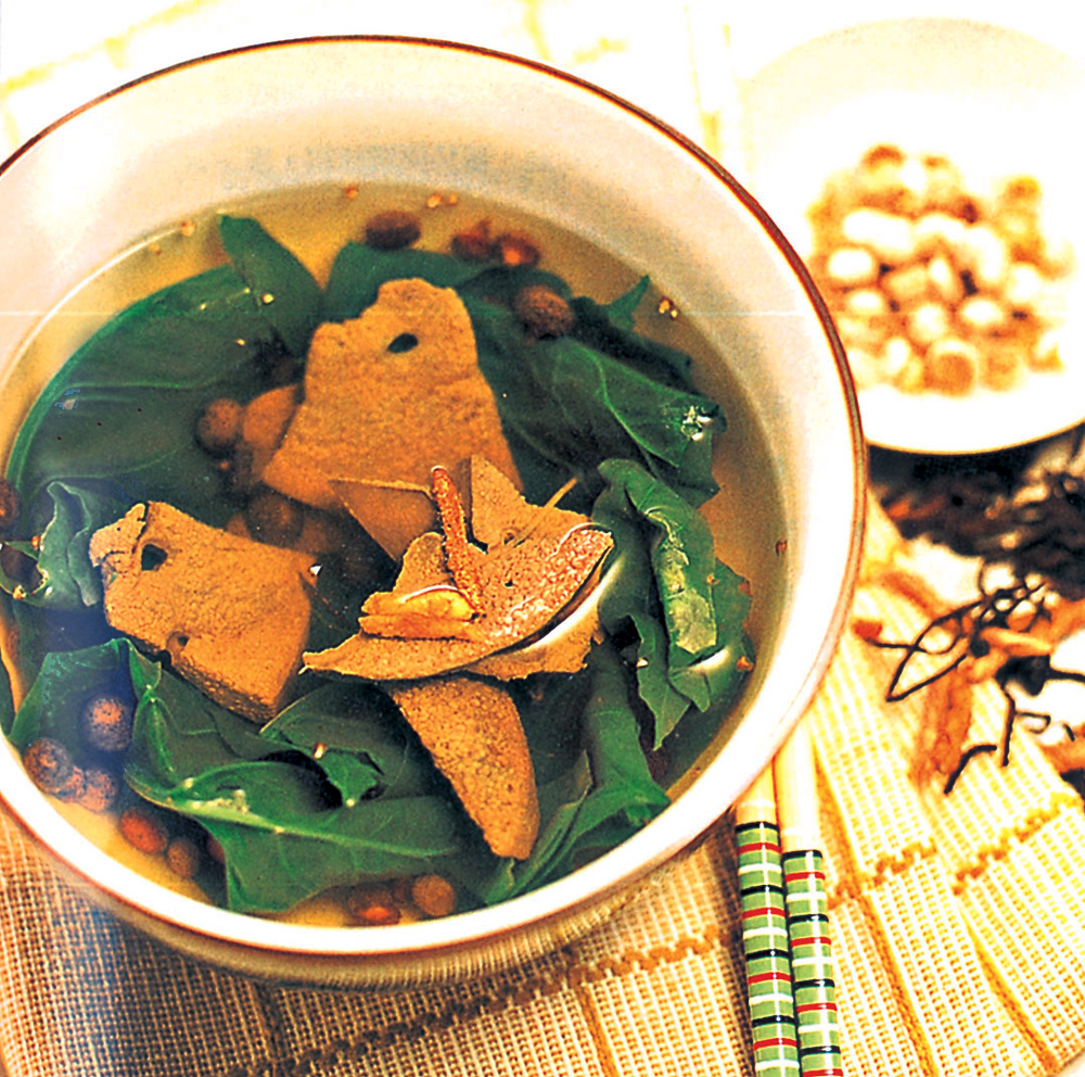 廣東人喜用豬膶(肝)和瘦肉灼粥或滾湯食,動物肝臟含豐富維生素A,能補肝明目,與中醫認為「肝開竅於目」的理論相合,是春季食療恩物。用豬膶滾湯,可用合時的枸杞菜(具清肝熱、滋陰功效)加枸杞子炮製。此湯對血虛肝旺,目眩頭暈者,有很好的食療功效。