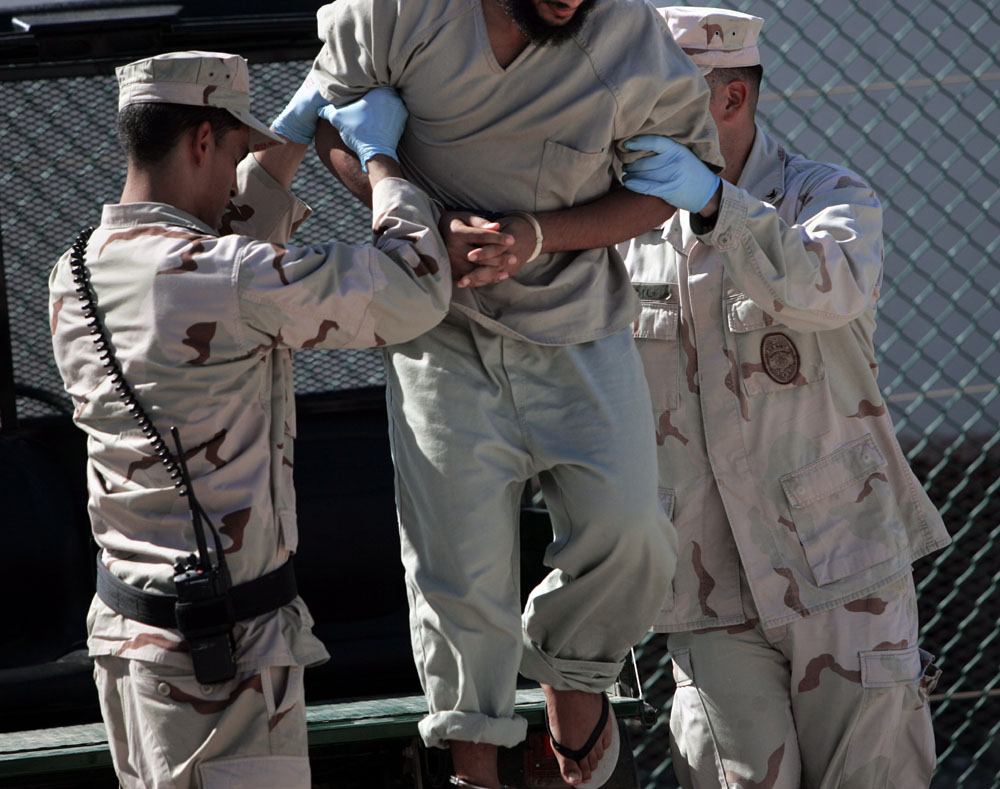 圖:美軍士兵將關押在關塔那摩監獄的恐怖疑犯帶走 (資料圖片)