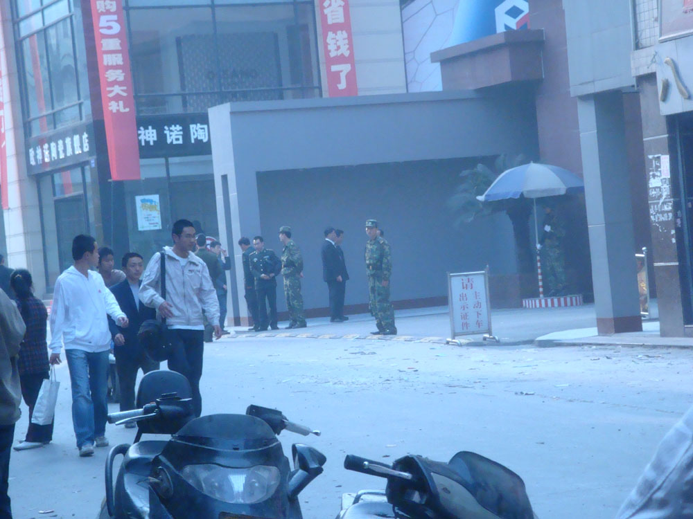 而事發部隊駐地門口已增派兩名站崗人員,門口道路並未封閉,警戒線已被撤下,道路通行一切正常,只是哨兵不准無關人員靠近部隊駐地大門。對面的建材商舖、小商店、小吃攤的經營也未見受影響,但雜貨舖裡站着便衣警察。此外,重慶汽車站和火車站檢查也格外嚴密。