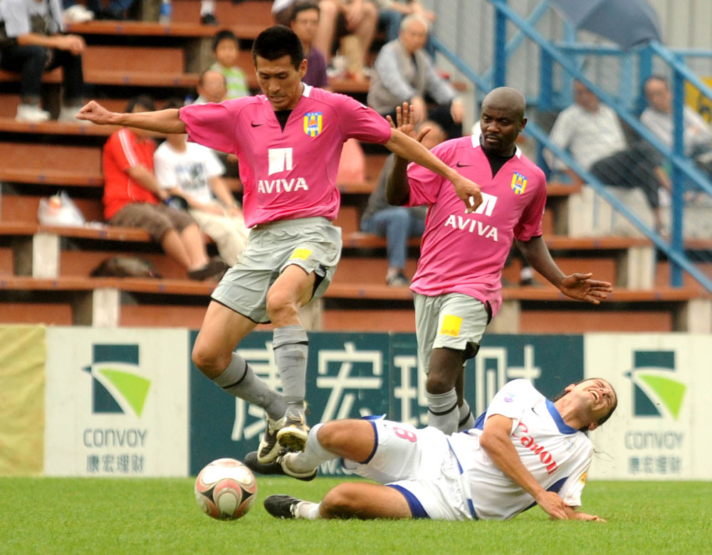 圖:傑志中場森姆迪奧(右)在晨曦的劉志強(左)與賓曹前後夾擊下倒地 (本報攝)