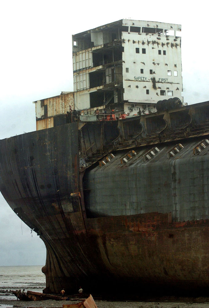 圖:孟加拉吉大港薛達卡度拆船海灘,一艘被拆貨輪