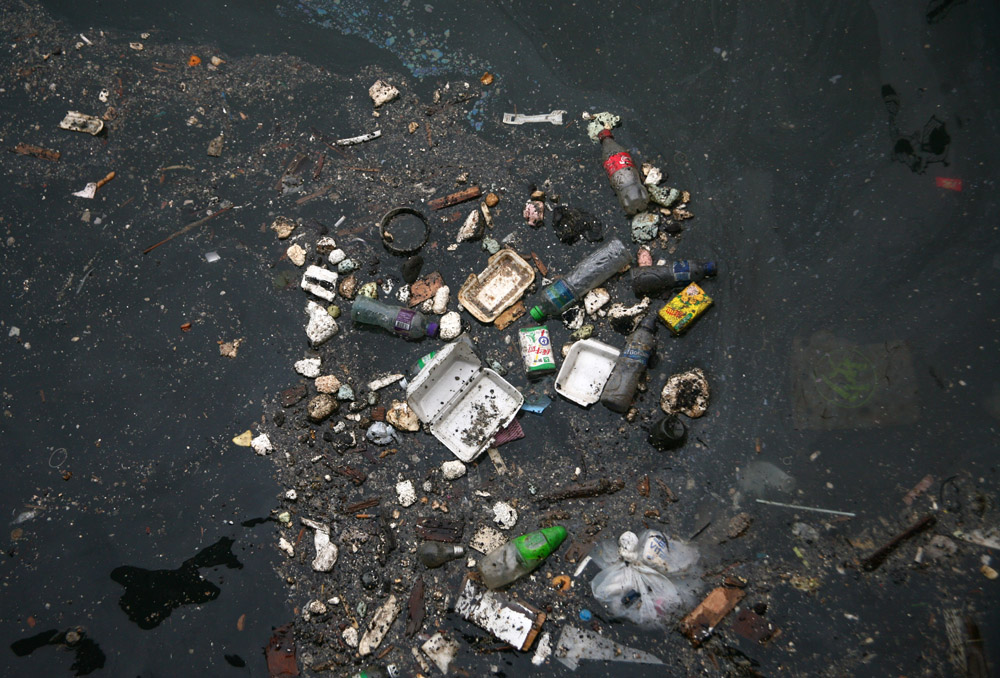 然而在九龍城碼頭的海邊,以風光秀麗著稱的維港的一角,竟如同被污染的河水般,漂浮着殘破的可樂瓶,泡沫飯盒,塑料袋等穢物,宛如「水上垃圾場」。海水被浸染得油黑渾濁,不但令魚類和海洋生物窒息,如拿支毛筆蘸蘸海水,立刻能揮毫潑墨。