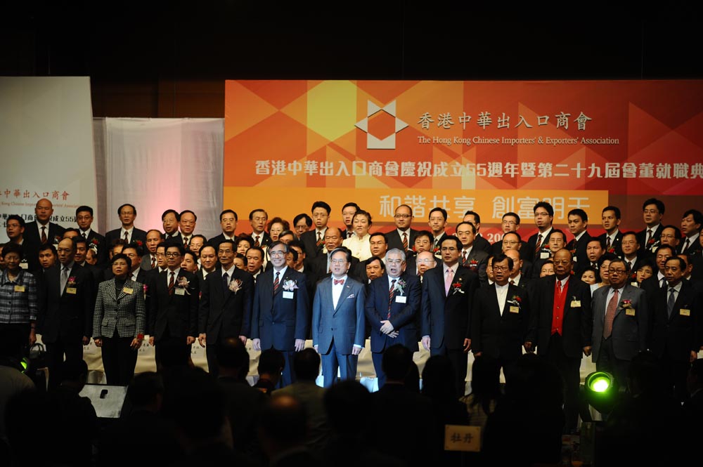 「和諧共享,創富明天」,香港中華出入口商會慶祝成立55周年暨第二十九屆會董就職禮昨晚在會展舉行。行政長官曾蔭權、中聯辦副主任黎桂康應邀出席主禮。本報記者 鄺儷