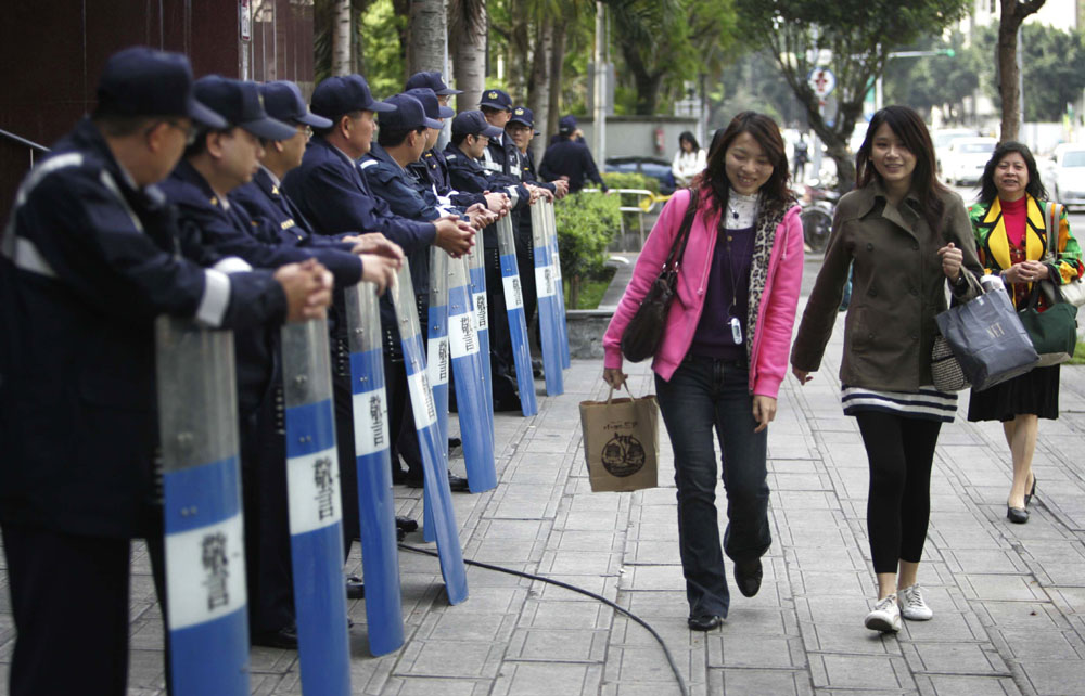 圖:台北地方法院二十六日傳喚多名前民進黨大員出庭,因而增派警員維持秩序 (美聯社)