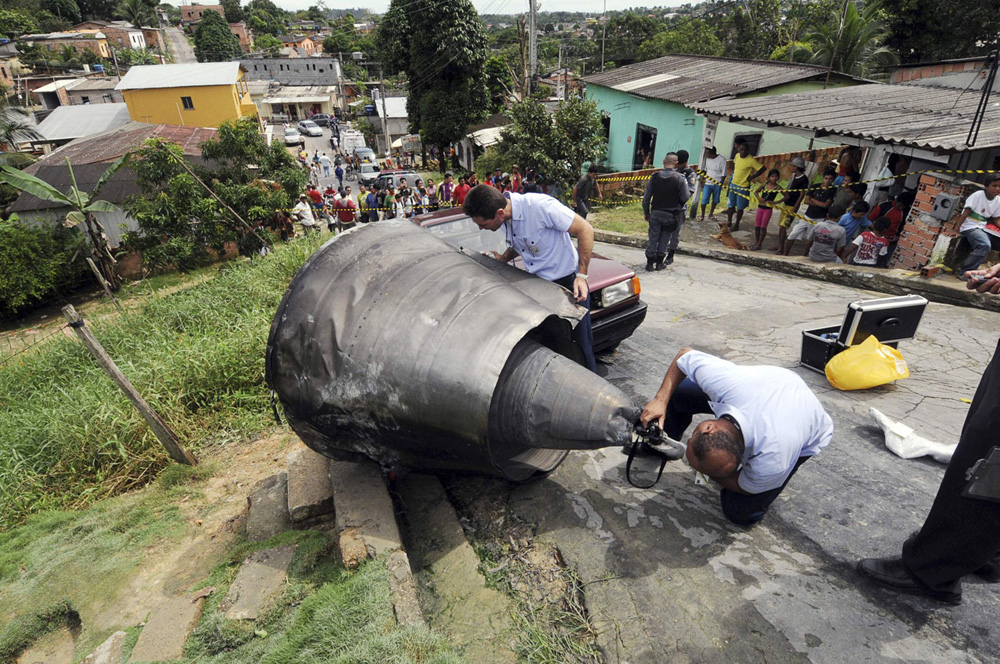 巴西電視台報道畫面顯示,這個跌落的飛機引擎碎片長約兩公尺,像火球一樣劃過夜空,從空中砸下來,造成多棟民宅受損,而途人則驚訝萬分。
