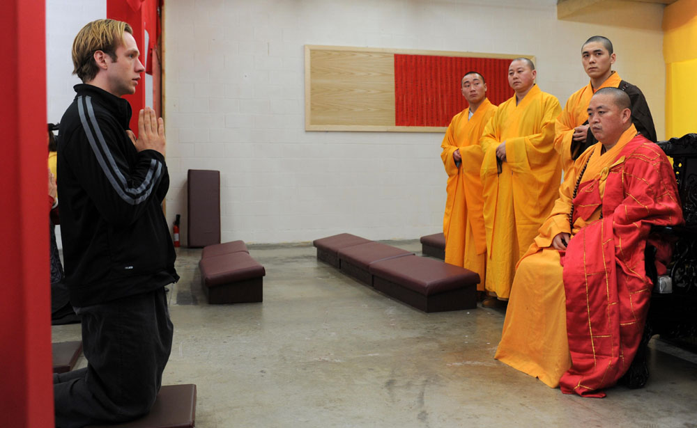 當地時間三月二十五日,中國河南嵩山少林寺方丈釋永信(右一)在洛杉磯少林文化中心為當地數十名善男信女親自主持皈依佛門儀式。