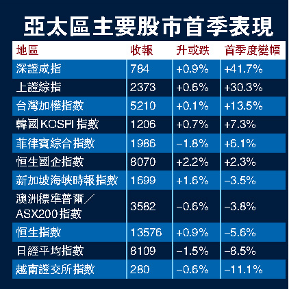 比較之下,歐洲的德國股市成績格外顯得亮麗,雖然在首季仍下跌了一成六,不過,截至周二中段,德股仍錄得5.7%的升幅,為自從去年四月以來最大的單月升幅。法國股市截至周二中段,在首季則錄得一成四的跌幅,與英國相同。