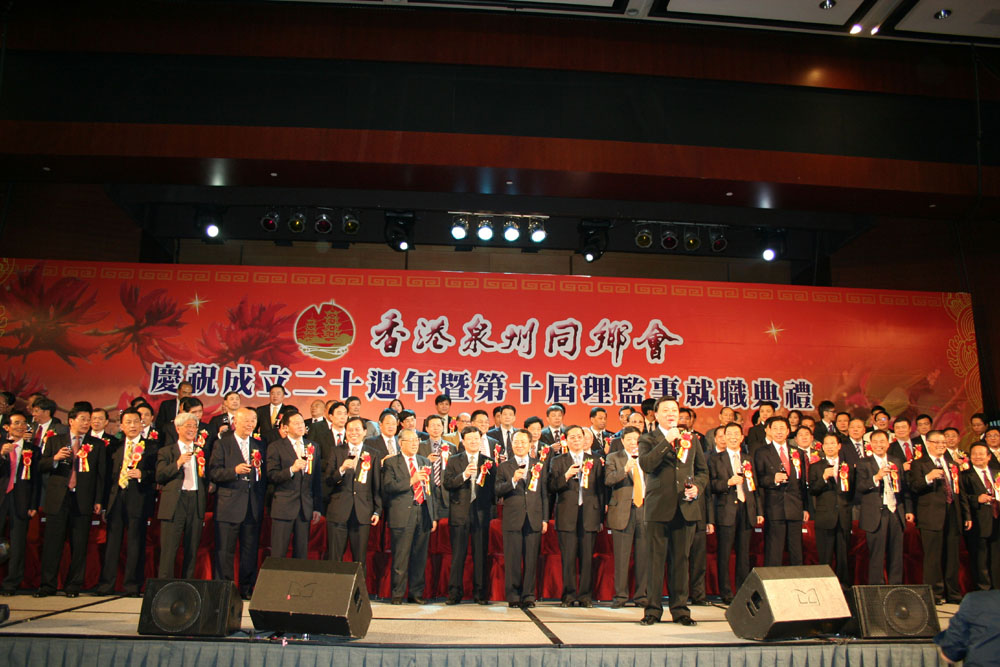 □香港泉州同鄉會日前於會展中心二樓宴會廳,隆重舉行成立二十周年暨第十屆理監事就職典禮。應邀擔任主禮嘉賓的有中聯辦副主任王志民,福建省統戰部副部長莊奕賢,華閩集團董事長楊東成,泉州市人大副主任魏堅,香港福建社團聯會主席林廣兆等。在全場逾千位各界賢達、友好,家鄉父老,會員鄉親的見證和祝福下,蔡毅、鄭亞鵬分別正式就任新一屆理、監事長。\本報記者 黃閩