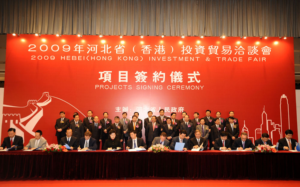 在簽約儀式上簽約的部分項目是:英屬威爾京群島默泰克集團獨資在石家莊建設年產5000台石油鑽採專用設備項目;石家莊遠洋城房地產開發與香港中國海外合資開發建設遠洋城勒泰中心項目;華潤電力(風能)開發uxian公司獨資在張北縣建設20萬千瓦風電場項目;河北新東亞房地產開發與英國樂購合作建設四萬四千平方米超市項目;曹妃甸工業區與伊朗富爾頓國際遊艇公司合資建設年產各類遊艇500艘項目等。