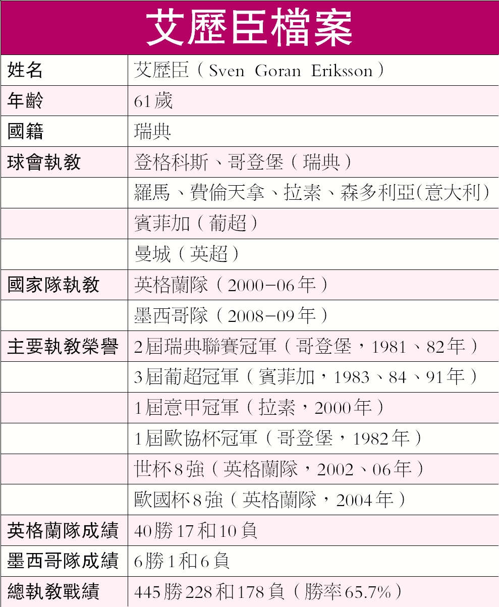 該名瑞典籍前英格蘭國家隊領隊,於2008年6月獲委任成為墨西哥國家隊教頭,至今領軍13仗,當中包括9場世界杯外圍賽和4場友賽,結果錄得6勝1和6負。曾任曼城領隊的艾歷臣亦有意重返英超聯執教。據艾歷臣的私人助理史迪爾表示:「我想將會有不少英超球隊樂於邀請他(艾歷臣)執教,他也會樂意返回英格蘭,他的首選會是1間具實力的英超聯球會,我頗為肯定重返英超是他的首選。」