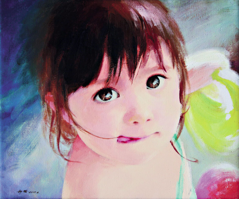 畫家的神來之筆更善於將他們一雙雙清澈純真、顧盼流光的眼睛敞開,流露出他們心靈之純淨和美麗,以及童真的可愛、可親、可貴。當你駐足在這樣的孩子面前,望着他們的臉,心靈所感受到的將不只幸福,還有愛、樂觀,和堅強。