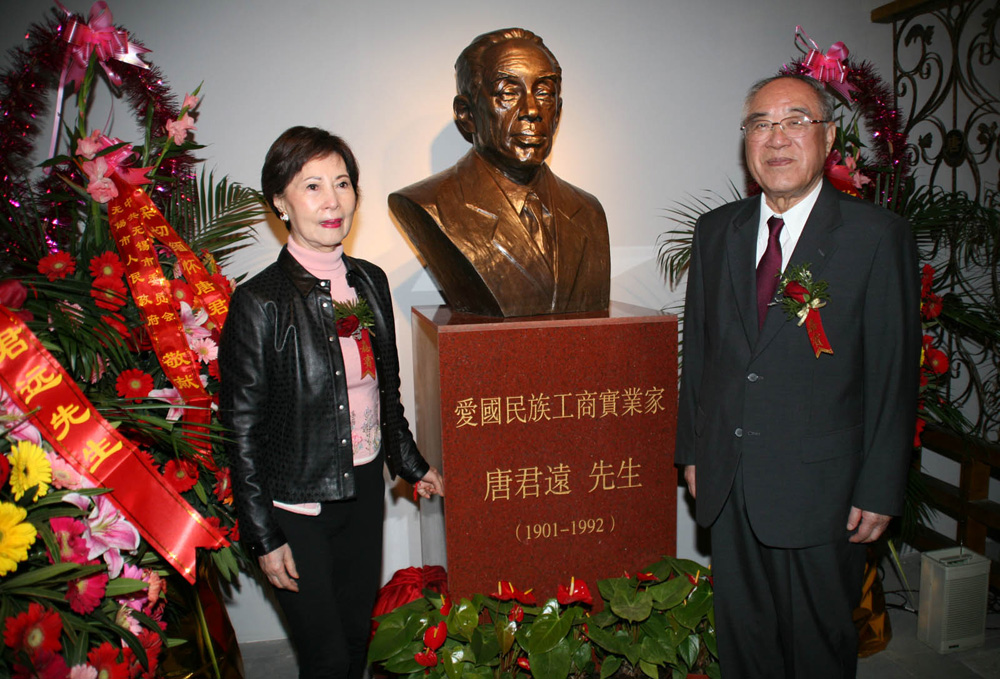 圖:唐翔千先生與夫人唐尤淑圻在唐君遠先生(唐英年祖父)的銅像旁