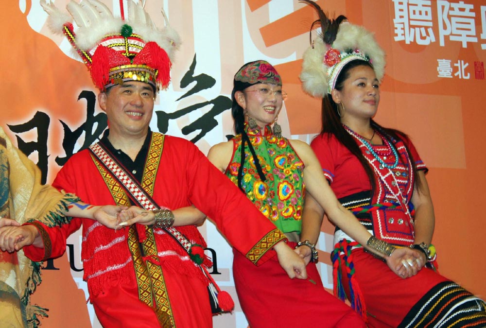 圖:《雲南映象》藝術總監和總編導楊麗萍(中)昨日與身穿台灣少數民族服裝的台北市長郝龍斌(左)共舞,藝術團將在台北小巨蛋演出(中新社)
