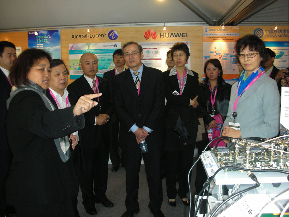 圖:在西班牙巴塞羅那舉行的「二○○九移動通訊世界大會」上,應科院副總裁易芝玲博士(左二)為中國移動通訊集團公司副總裁沙躍家(左六)、中國移動集團公司技術部部長及前中國移動公司研究院院長周建明(左三)、中國移動研究院副院長王曉雲(右四)及TD-SCDMA產業聯盟秘書長楊驊(左四)等介紹應科院TD-LTE技術