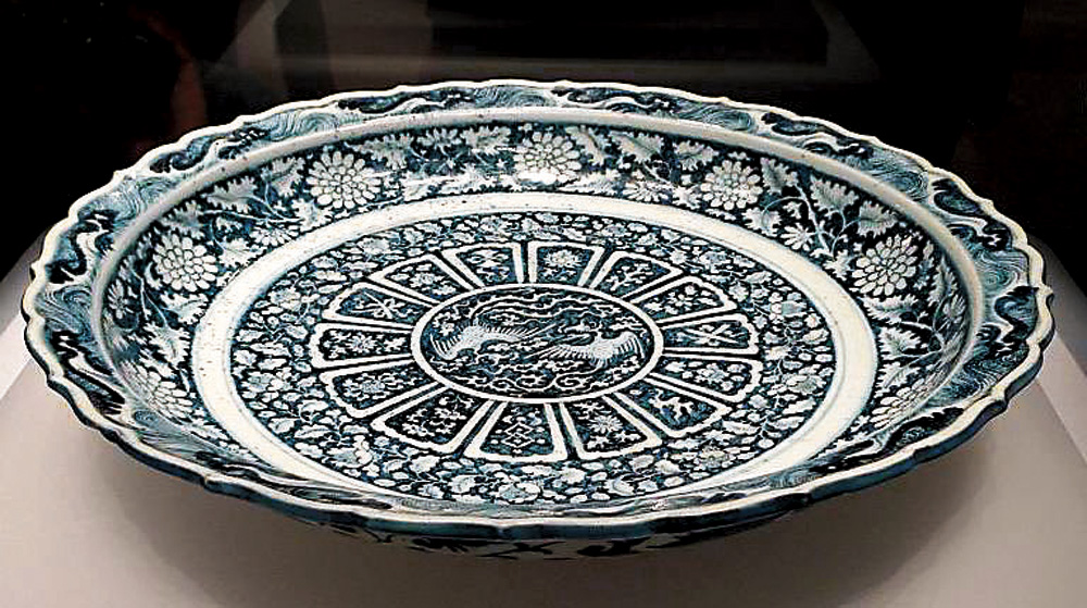 圖:青花藍地白花雙鳳紋菱花口大盤(伊朗國家博物館藏)