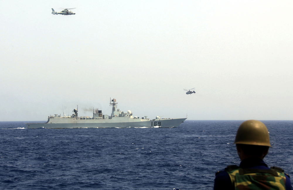 圖:十六日,中國海軍第一、第二批護航編隊在亞丁灣海域實施第二次共同護航。圖為兩批護航編隊的兩架艦載直升機同步起飛,進行空中護航巡邏(中新社)