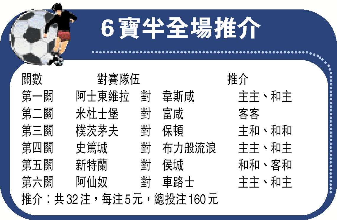 今周在主客和三串四方面,將會介紹一場德甲及兩場英超,分別為禾夫斯堡主勝、米杜士堡主勝及新特蘭主勝。