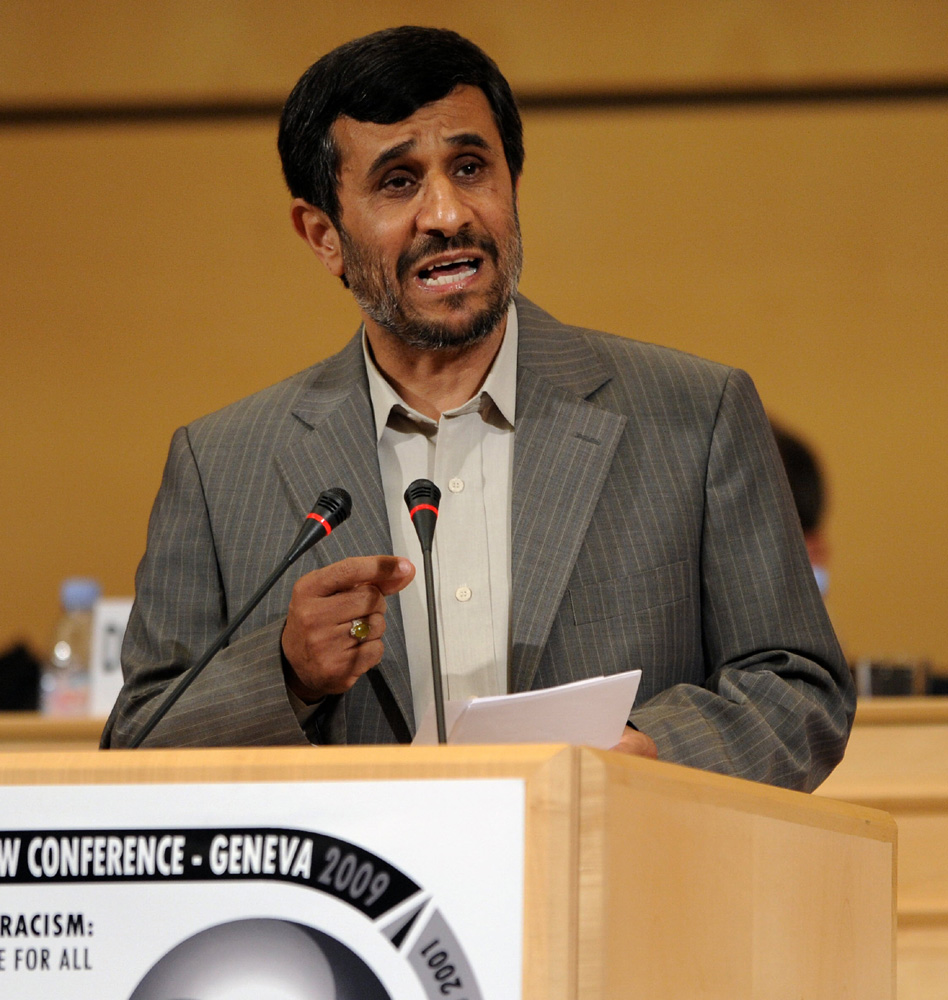 內賈德二十日在大會上發表演說,指責以色列是「最殘酷和種族主義色彩最重的政權」,在場的歐盟各國外交官立即大批離場,旁聽的非政府組織也大聲鼓噪,場面混亂。一名戴假髮的抗議者高叫「種族主義者!種族主義者!」又向內賈德投擲一個紅色的軟物件。該物件打中了講台,但也同時打斷了演說。內賈德開始發言時,至少三名打扮成小丑並高叫「種族主義者」的示威者被逐離場。聯合國秘書長潘基文稱,伊朗總統的發言是指罵、分化,甚至是煽動,與大會的主題相違背。