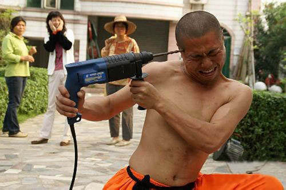 胡師傅的表演嚇得圍觀的觀眾瞠目結舌,多數女遊客用手捂住雙眼。一分鐘過後,大師終於把電鑽拿下來,他的太陽穴居然只擦破了皮。胡師傅又將衝擊鑽鑽向自己的肚皮。一分鐘後,電鑽停下,胡師傅的肚皮只紅一點表皮,毫髮無損。