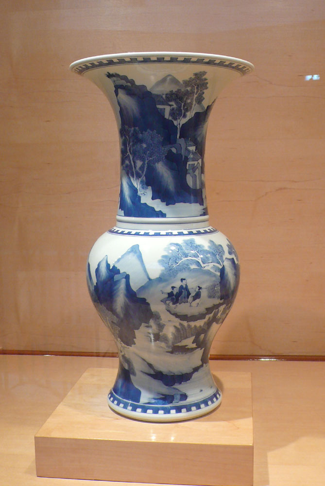 黃雲鵬表示,仿青花的技巧在於造型要端莊,釉面和胎面達到玉質肥潤,色澤青翠,繪圖栩栩如生。如展品中一件仿康熙「青花山水人物紋鳳尾尊」,便達到「釉分五色」,呈現出釉色的濃淡、深淺變化,釉色清新明快,該件鳳尾尊原作現藏於北京故宮博物院。