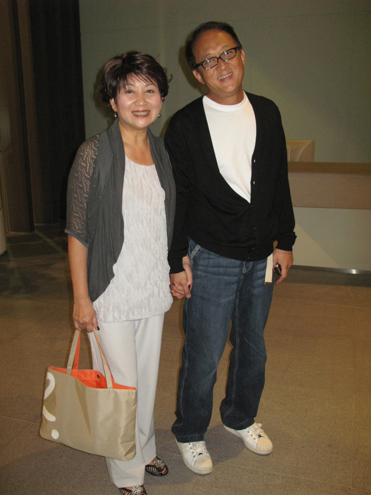 圖:鮑姐(左)在丈夫方平陪同下為節目錄影
