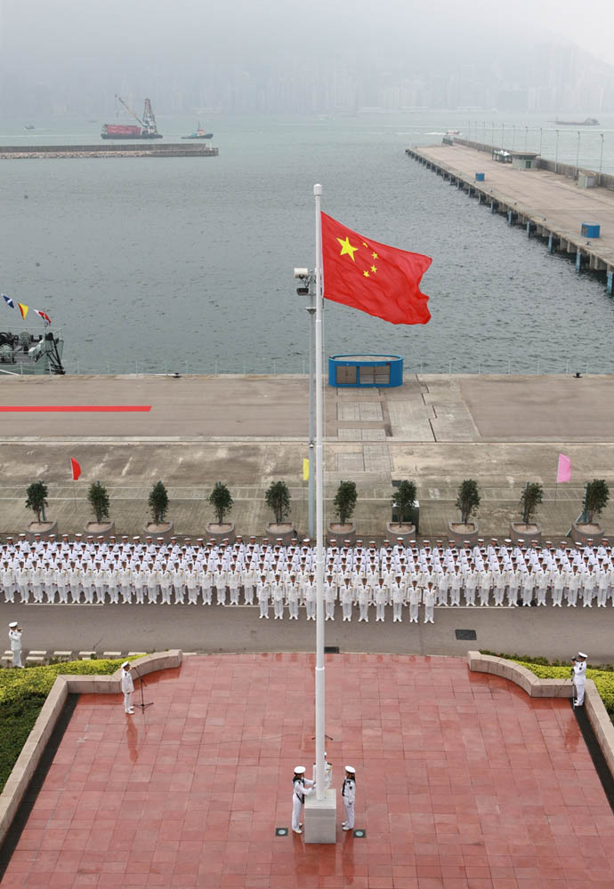 上午8時30分,在位於九龍半島的昂船洲軍營,駐港部隊海軍部隊全體官兵舉行了莊嚴肅穆的升國旗儀式。9時20分,駐軍在昂船洲軍營碼頭,舉行了海軍閱兵儀式。在「傳承人民海軍優良傳統,爭當藍色國土忠誠衛士」橫幅的背景下,駐港部隊司令員張仕波少將檢閱了受閱的艦艇和海軍部隊的官兵。艦艇威武雄壯,官兵士氣高昂。駐軍海軍部隊參謀長許景才大校在向官兵們致辭時,回顧了我國海軍和駐軍海軍部隊建立以來的歷史,展望了駐軍海軍部隊建設的未來。