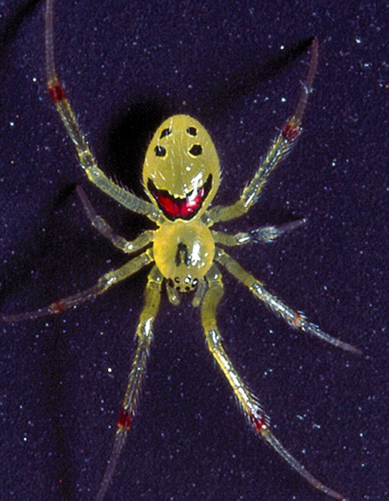 美國夏威夷有一種「笑臉蜘蛛」,身上生有笑臉花紋,令科學家嘖嘖稱奇。他們相信,這個獨特的圖案是用來阻嚇其他獵食動物。
