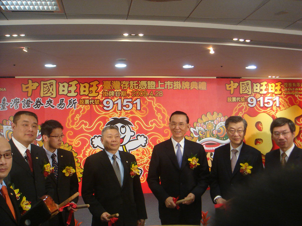中國旺旺是馬政府上台以來,第一家成功回台掛牌上市的大陸台商。為了歡迎貴客,二十八日上午,台證交所在一○一大樓鋪紅地毯為中國旺旺TDR舉行盛大掛牌典禮,中國旺旺董事長蔡衍明也專程回台出席上市掛牌典禮,記錄這衣錦還鄉的一刻。