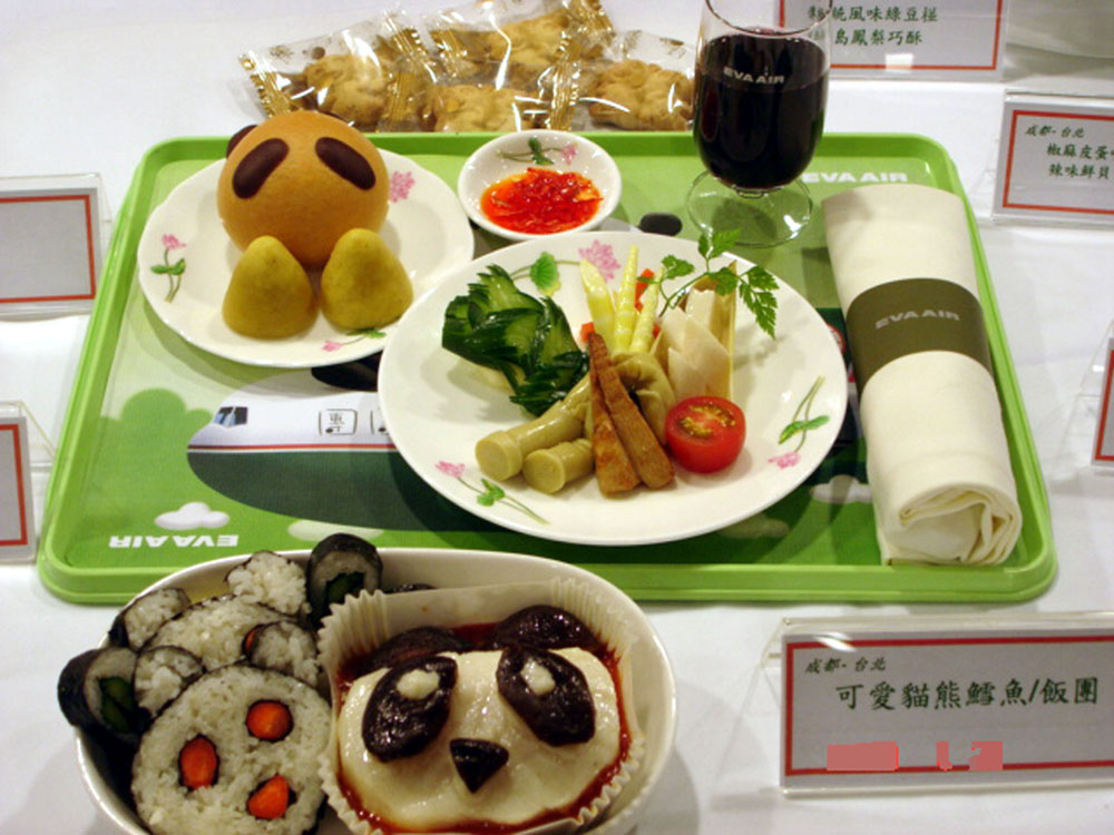 長榮航空二十九日宣布將開航成都包機,機上提供的熊貓特色餐有台灣五種竹筍組合的開胃菜和熊貓模樣的壽司。(中央社)