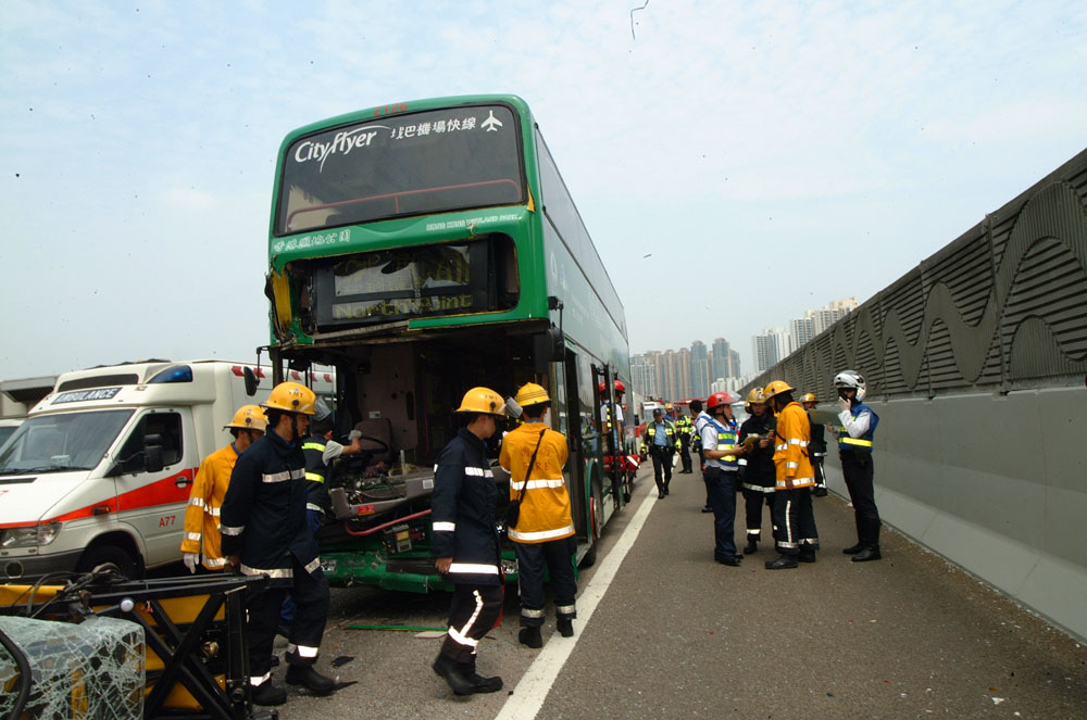 肇事城巴行走A11線,由機場開出往北角碼頭,當時車上有十名乘客。現場為西九龍快速公路駛往西隧方向大角咀奧海城對開的慢線,上址有修路地盤,一輛車尾裝有防撞「彈弓」安全裝置的「箭咀車」停在上址,工人並於車尾不遠位置放有「雪糕筒」示警。昨日上午十時三十三分,朱姓司機駕駛機場巴士駛至上址不遠處時,疑心臟病發不適,即時取出應急藥物「脷底丸」,惟服食時突然「眼前一黑」,巴士便失控直撞向工程車尾,並將前車推前近二十米始停下,巴士下層車頭嚴重損毀,司機受傷被困。
