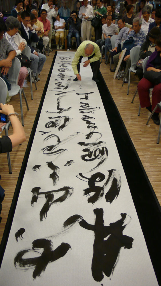 圖:靳杰強即席揮毫,大筆書寫一幅長卷(本報攝)