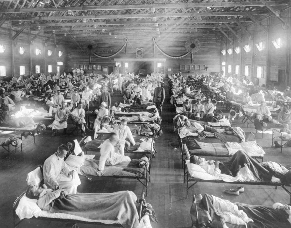 圖:一九一八年「西班牙流感」爆發時,美國堪薩斯州的一間醫院擠滿病人(美聯社)