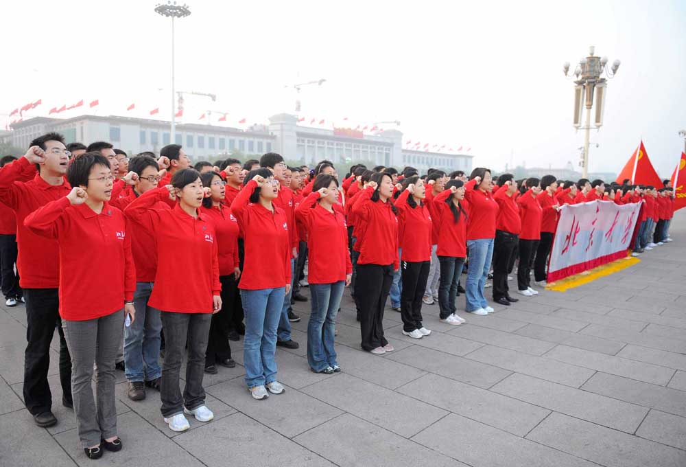 圖:四日,二百多名北京大學學生參加了天安門廣場升國旗儀式,並在國旗下宣誓,表達自己繼承和發揚五四精神的決心(新華社)