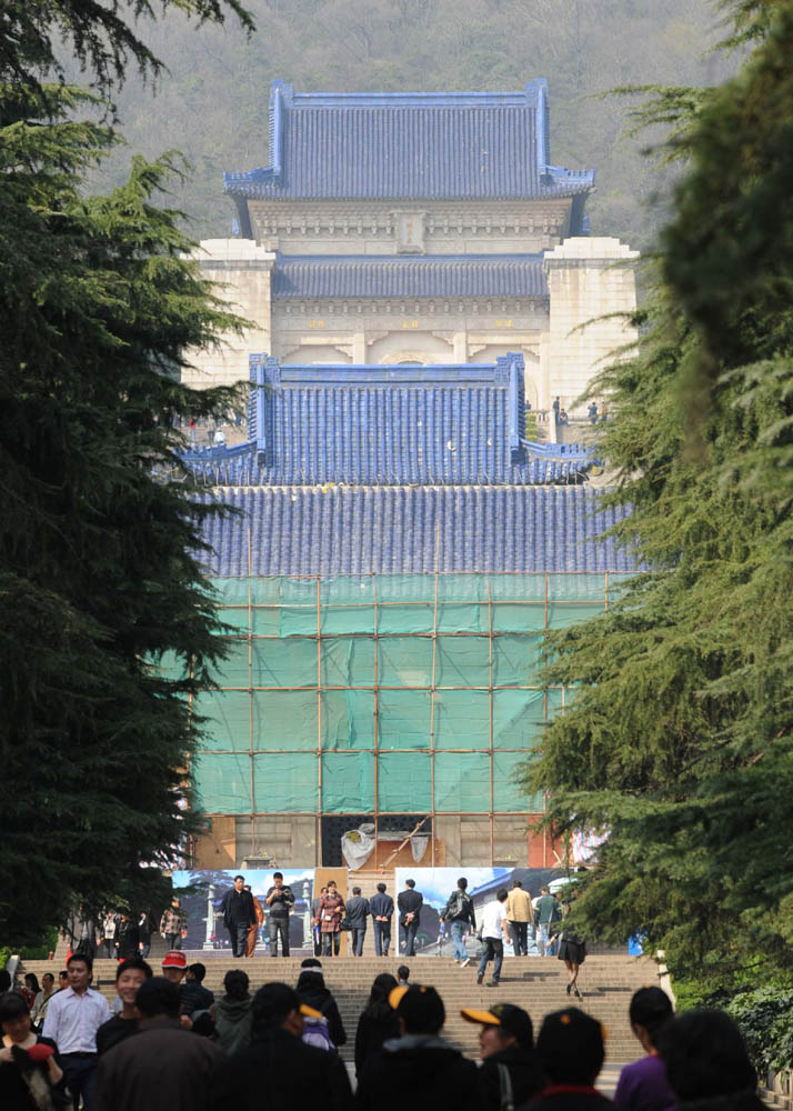圖:南京中山陵維修工程已於在五月一日前完工,按原貌更換了陵門及博愛牌坊的部分琉璃瓦和琉璃構件、解決靈堂西北角滲漏,同時也修整了路面和排水系統。這是維修中陵園管理部門採取有效防護措施確保遊客安全(新華社)