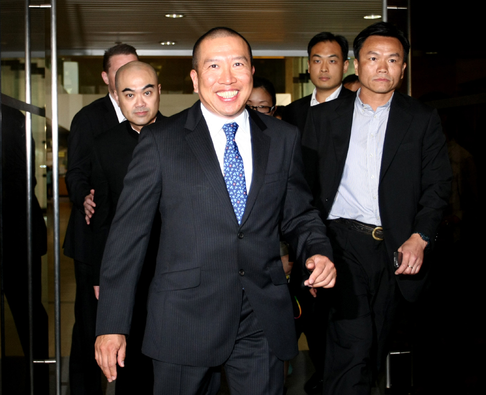 圖:步入法庭只需數十秒的路程,陳振聰被傳媒包圍下卻要用上三分鐘時間。圖為陳步出法庭時仍面露笑容(林雨燊攝)