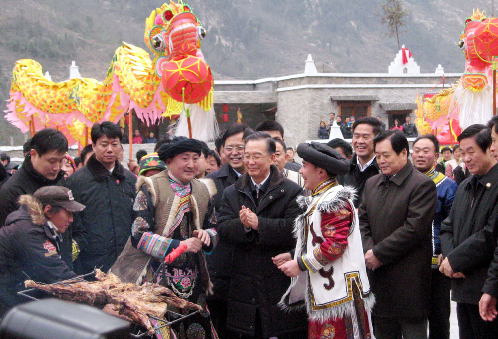 圖:國務院總理溫家寶與吉娜羌寨村民迎接大地震後第一個春節(中新社)