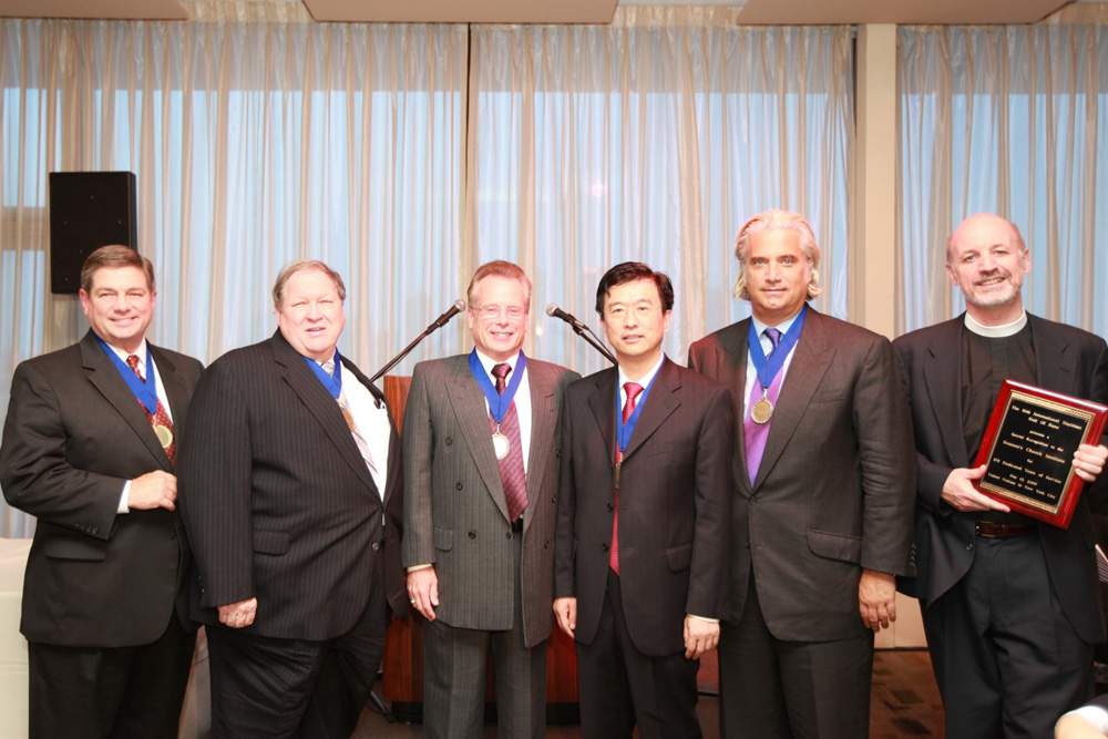 圖:中海集團總裁李紹德(左四)與同時獲獎的國際船員組織主席布朗、美國通用海事公司主席喬治普羅斯、美國喬治亞港務局總裁馬詹德、美國港口集團高級顧問蒂爾頓等人合影